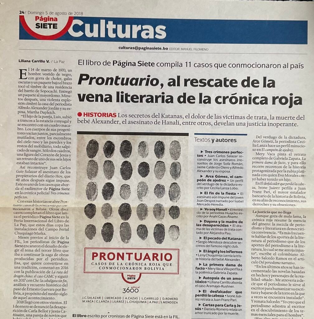 Con esas historias se abre Prontuario: casos de la crónica roja que conmocionaron a Bolivia. Otros diez casos completan el libro que lanza el periódico Página Siete en la Feria Internacional del Libro de La Paz, que estos días copa las instalaciones del Campo Ferial Chuquiago Marka.