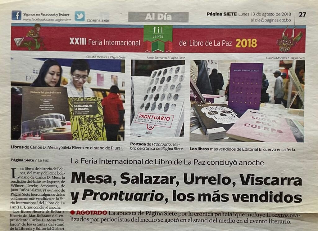 Prontuario, la apuesta de Página Siete y 3600 por la crónica roja hecha en Bolivia se agotó en el stand del periódico en varias ocasiones durante el transcurso de la feria.