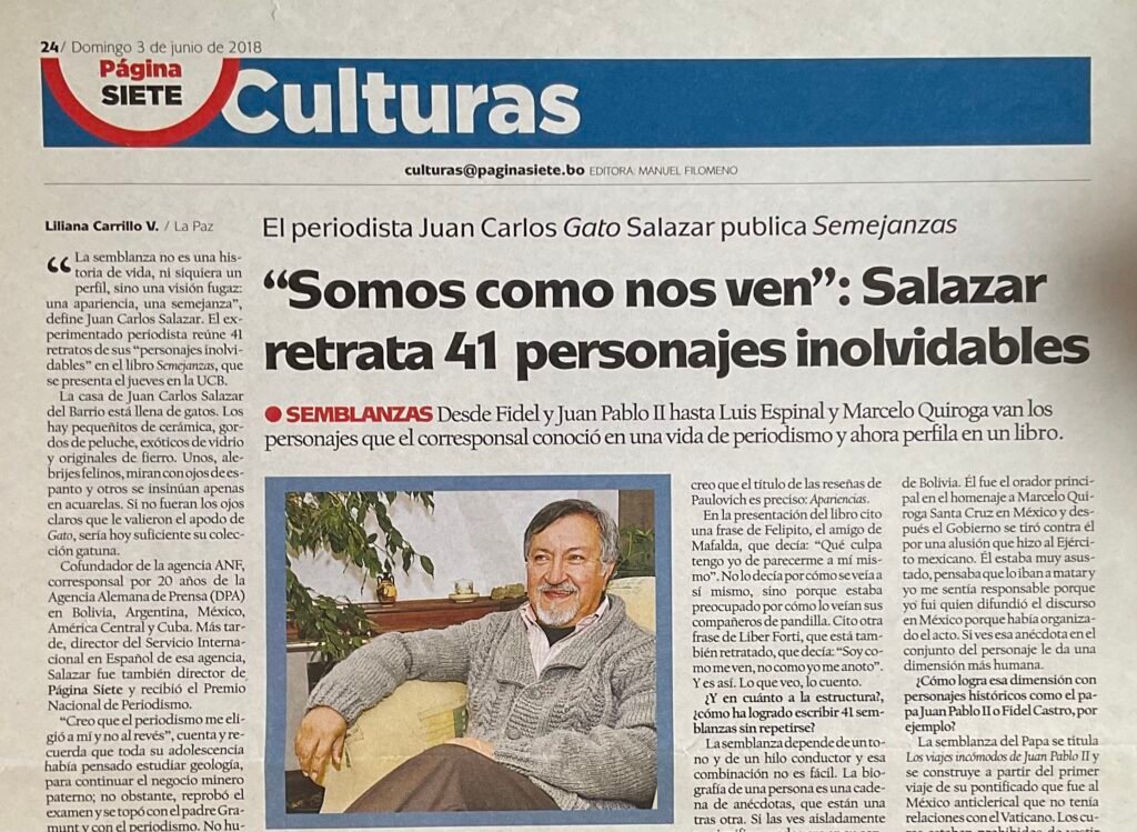 “La semblanza no es una historia de vida, ni siquiera un perfil, sino una visión fugaz: una apariencia, una semejanza”, define Juan Carlos Salazar. El experimentado periodista reúne 41 retratos de sus “personajes inolvidables” en el libro Semejanzas, que se presenta el jueves en la UCB.