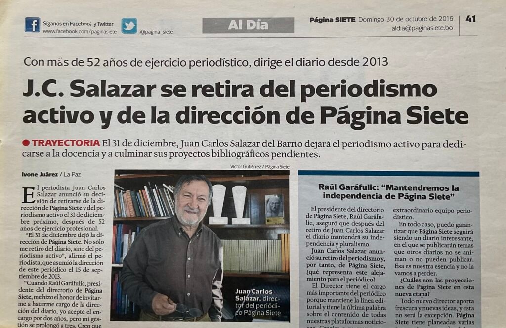 Salazar está al frente de Página Siete desde 2013 y recientemente anunció su retiro del periodismo activo y la dirección de este matutino después de un ataque sistemático del Gobierno.