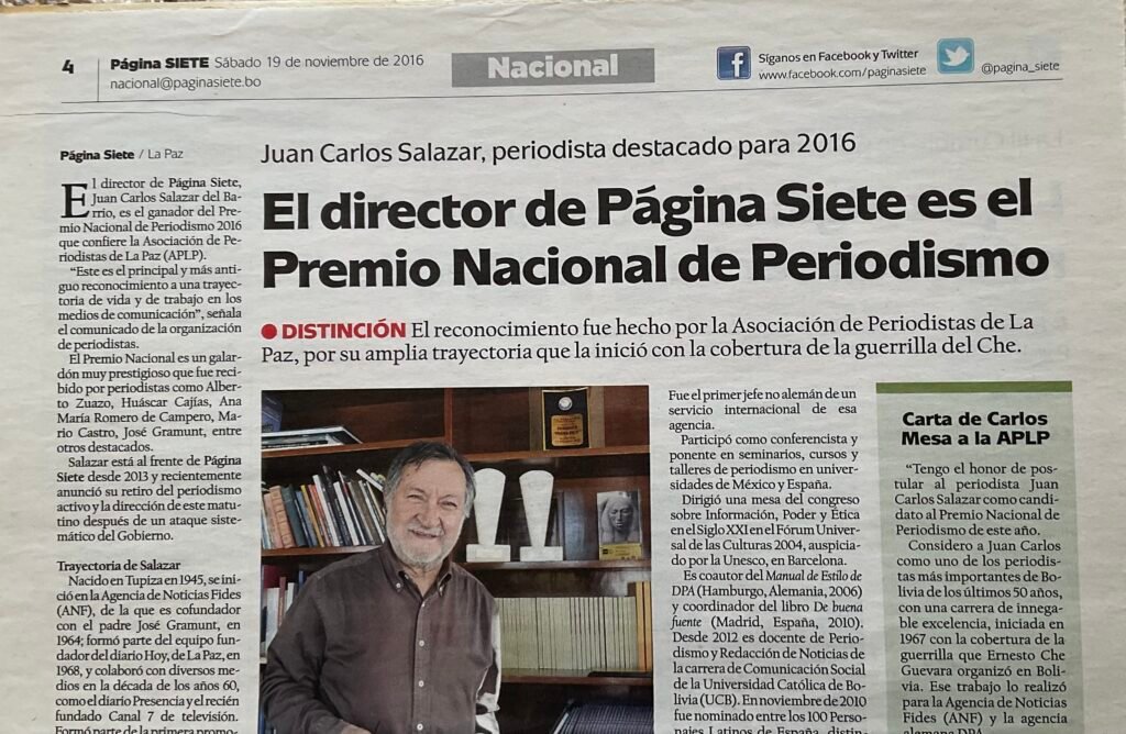 El director de Página Siete, Juan Carlos Salazar del Barrio, es el ganador del Premio Nacional de Periodismo 2016 que confiere la Asociación de Periodistas de La Paz (APLP).